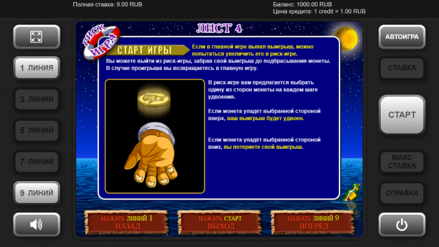 Удвоить выплату можно в рисковом раунде. Игра проходит на отдельном экране. Перед геймером изображена рука, бросающая монету. Гэмблеру предстоит отгадать какой стороной она упадет — «орел» или «решка». Верный прогноз гарантирует умножение выигрыша в 2 раза. Ошибочный выбор аннулирует выплату за последний спин.